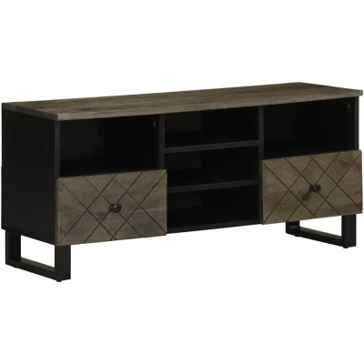 ManoManoGeneral description This TV cabinet with ample storage space is a practical and eye-catching addition to your living room or bedroom. Made from solid mango wood, it offers exceptional durability and strength, while its unique wood grains ensure that each piece is slightly different. Technical specifications Colour: Black Material: Solid mango wood with grey finish, engineered wood, metal Overall dimensions: 100 x 33 x 46 cm (L x W x H) Leg height: 10 cm Assembly required: Yes Usage This TV cabinet provides ample storage space for keeping your magazines, books, DVDs, and multimedia devices well-organised and within reach. The sturdy top is ideal for placing your TV and stereo systems or decorative items like vases or potted plants. Other information Each item is unique with variations in colours and grains, ensuring the exclusivity and individuality of your product.