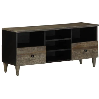 ManoManoGeneral description This wooden TV cabinet with ample storage space is a practical and eye-catching addition to your living room or bedroom. Made from solid mango wood, this robust tropical hardwood is highly favored for furniture making due to its exceptional durability and strength. The beautiful wood grains ensure that each piece of furniture is unique. Technical specifications Colour: Black Material: Solid mango wood with light grey finish, engineered wood Dimensions: 100 x 33 x 46 cm (W x D x H) Storage: 2 drawers and 5 open compartments Assembly required: Yes SKU: 4017810 Usage Ideal for organizing magazines, books, DVDs, and multimedia devices. Sturdy top suitable for placing your TV, stereo systems, or decorative items like vases or potted plants. Easy to clean with a damp cloth and requires minimal maintenance. Other information Each item is unique with variations in colours and grains. Delivery is random, ensuring the exclusivity and individuality of your product.