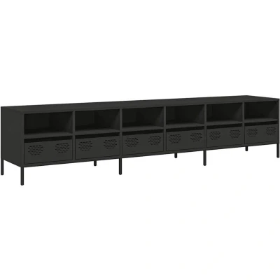 ManoManoGeneral description This TV cabinet with ample storage space is a practical and eye-catching addition to your living room or bedroom. It is designed to keep your magazines, books, DVDs, and multimedia devices well-organized and within reach. Technical specifications Colour: Black Material: Cold-rolled steel Dimensions: 202 x 39 x 43.5 cm (L x W x H) With 6 drawers and 6 compartments Assembly required: Yes Usage The sturdy top is ideal for placing your TV and stereo systems or decorative items like vases or potted plants. The TV stand is easy to clean with a damp cloth and requires less maintenance. Other information