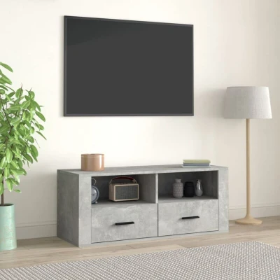 General description This classic TV cabinet is a practical and eye-catching addition to your interior. Made from high-quality engineered wood, it features a smooth surface, strength, stability, and resistance to moisture. Technical specifications Colour: Concrete grey Material: Engineered wood Dimensions: 100 x 35 x 40 cm (W x D x H) SKU: 816812 Compatibility and accessories Includes an assembly manual for easy assembly. Usage Ample storage space with drawers and compartments for DVD players, game consoles, streaming devices, and media carriers. The sturdy top serves as an ideal place for books and ornaments. Other information