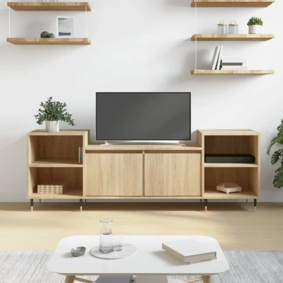 General description Featuring a stylish yet practical design, this TV cabinet is meant to become a focal point of your room. The engineered wood construction ensures exceptional quality with a smooth surface, providing strength, stability, and resistance to moisture. Technical specifications Colour: Sonoma oak Material: Engineered wood, metal Dimensions: 160 x 35 x 55 cm (W x D x H) Assembly required: Yes Usage Ample storage space: Equipped with 6 compartments, the TV stand offers ample storage space to keep all your magazines, DVDs, and other items well organized. Sturdy top: The top of the TV unit provides a secure surface to display decorative objects, photo frames, or potted plants. Practical doors: Keep your essentials free from dust by hiding them behind the doors of the media cabinet. Other information Warning: To prevent it from being overturned, this product must be used with the provided wall attachment device. SKU: 831335