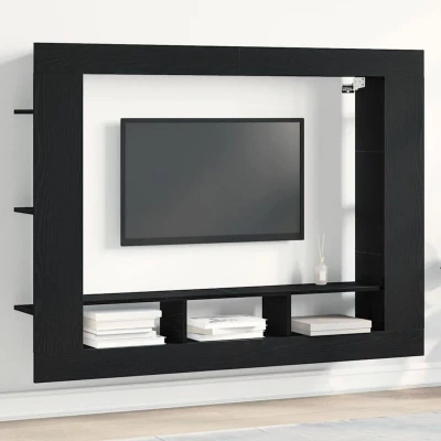 ManoManoGeneral description This TV cabinet, crafted from smooth black oak, offers a modern and stylish solution for your living room or office. Its sleek design and clean lines not only serve a functional purpose but also make a stylish statement that complements your decor while providing robust support for your multimedia devices. The wall-mounted feature saves floor space, making it ideal for smaller areas or minimalist setups. Technical specifications Dimensions: 152 x 22 x 113 cm Material: Synthetic Particle Board Colour: Black Finish: Matte Shape: Rectangular Surface Height: 1.5 cm Indoor/Outdoor: Indoor Only Assembly Required: Yes Recommended Number of People for Assembly: 2 Capacity: Suitable for standard TV sizes Mounting Included: Yes SKU: 861999 EAN: 8721158789037 Usage Perfect for organizing multimedia devices, game consoles, and decorative items. Easy to clean surfaces make it suitable for families and convenient living spaces. Other information