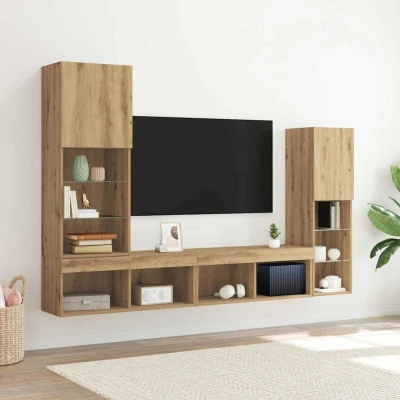 ManoManoGeneral description This TV cabinet with LED lights is a stylish feature for your living room, designed to accommodate your entertainment essentials perfectly. Its modern artisan oak color and integrated blue LED lighting add a classy touch to any room, making it ideal for family gatherings while providing ample space for your media gadgets and decorative pieces. Technical specifications Dimensions: 40.5 x 30 x 102 cm Material: Engineered wood Color: Brown Light Color: Blue Finish: Matte Indoor/Outdoor: Indoor Only Number of Doors: 6 Maximum Weight Capacity: 50 kg Assembly Required: Yes SKU: 3334390 EAN: 8721158868480 Usage Spacious Layout: Features twelve shelves for organizing books, collectibles, and media devices. Integrated Blue LED Lights: Enhance the ambiance of your living area. Hinge Door Design: Six standard hinge doors provide easy access to your items. Contemporary Style: Complements various interior styles, especially modern aesthetics. Other information