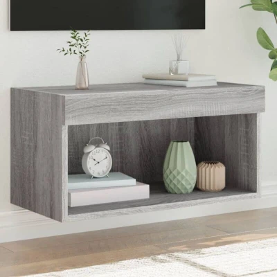 ManoManoGeneral description Featuring a trendy yet practical design, this TV cabinet with LED lights will become a focal point of your room. Made of high-quality engineered wood, it is sturdy, durable, and resistant to moisture. The cabinet offers ample storage space for your DVD players, receivers, disks, and other small items, keeping them well organized and within reach. Additionally, it includes RGB LED lights that can change colors automatically, enhancing the ambiance of your entertainment area. The wall-mounted design maximizes floor space and keeps the area clean. Technical specifications Colour: Grey sonoma Material: Engineered wood Dimensions: 60 x 30 x 30 cm (L x W x H) Power: DC 5V (USB power source not included) Assembly required: Yes Installation Screws and plugs for wall mounting are not included. It is advised to use screws and plugs suitable for your specific wall type. Please read and follow each step of the instructions carefully. Usage This TV cabinet is designed for use