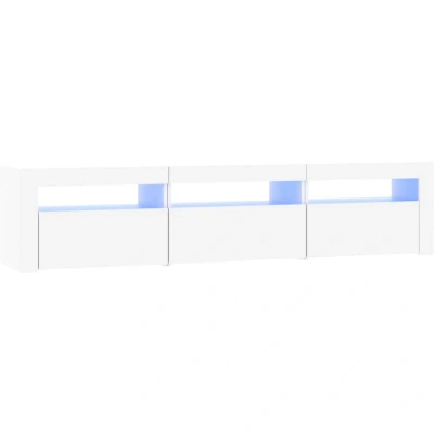 ManoManoGeneral description Featuring a trendy yet practical design, this TV cabinet with LED lights becomes a focal point of your room. The cabinet is made from high-quality engineered wood, ensuring strength, stability, and moisture resistance. It includes colorful RGB LED lights that can change colors automatically, enhancing the modern aesthetic of your space. Technical specifications Material: Engineered wood Colour: White Overall dimensions: 180 x 35 x 40 cm (L x W x H) Power: DC 5V (USB power source not included) Features: RGB LED lights Storage and display Ample storage space for magazines, books, remote controls, and other small items. Sturdy top ideal for displaying decorative objects, photo frames, or potted plants. Other information Delivery contains: 1 x TV cabinet (middle), 2 x TV cabinet (side) Assembly manual included for easy setup.