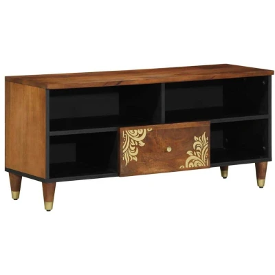 ManoManoGeneral description This TV cabinet merges functionality with a modern look, designed for the living room. It enhances your viewing experience while fitting well with various home styles. Made from solid textured mango wood, it offers both storage and style in one sleek piece, keeping your space organized and clutter-free. Technical specifications Colour: Brown Material: Solid mango wood Overall dimensions: 100 x 33.5 x 46 cm (L x W x H) Weight: 18.25 kg Storage: With drawer and shelf Indoor / outdoor: Indoor only Assembly required: Yes EAN: 8721158497512 SKU: 4018752 Usage Perfect for storing electronics, DVDs, and other items to keep your living area tidy. Easy to maintain; simply wipe down with a damp cloth to keep it looking great. Other information