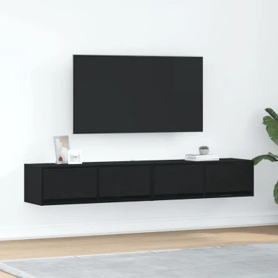 General description These TV wall cabinets are the perfect solution for your living space, maximizing space and keeping floor areas uncluttered. The cabinets are designed to provide ample storage for magazines, books, DVDs, and multimedia devices, ensuring everything is well-organized and within reach. The sturdy top is ideal for placing your TV, stereo systems, or decorative items like vases or potted plants. With a space-saving design, these cabinets can be wall-mounted to enhance your floor space and maintain a clean area. The smooth surface makes them easy to clean and requires minimal maintenance. Technical specifications Colour: Black oak Material: Engineered wood Overall dimensions (each): 80 x 31 x 25.5 cm (W x D x H) Drawer dimensions (each): 37 x 23.5 x 19.5 cm (W x D x H) Overall max. weight capacity: 60 kg Max. weight capacity per drawer: 5 kg With 2 drawers Assembly required: Yes Other information Delivery contains: 2 x TV cabinet