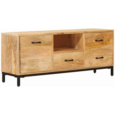 ManoManoThis modern TV stand is designed to showcase and organize your home entertainment systems while adding a touch of elegance to your living room. With a clean, rectangular shape and minimalist lines, it complements any décor. Perfect for those who appreciate functional design, this piece acts as an entertainment center with a focus on simplicity and practicality. Its spacious surface offers plenty of room for a large television, decorative items, or other electronic devices, becoming an essential centerpiece for media consumption. Premium Mango Wood Construction Renowned for its durability and beautiful grain patterns, solid mango wood gives this TV stand both stability and a natural, earthy appearance. Excellent for supporting heavy electronics, mango wood elevates the overall aesthetic of your living space, providing a premium feel without the need for constant upkeep. Spacious Storage Options Designed with modern needs in mind, the stand includes a combination of doors and drawers,