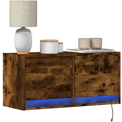 ManoManoGeneral description This TV wall cabinet is the perfect solution for your living space to maximize space and keep the floor areas uncluttered. It features a wall-mounted design that converts unused wall space into a compact and efficient storage area, making it ideal for modern interiors. Technical specifications Colour: Smoked oak Material: Engineered wood Dimensions: 80 x 31 x 38 cm (L x W x H) Number of drawers: 2 With LED lights Assembly required: Yes Installation Installation should be carried out according to the provided instructions to avoid safety risks. A wall attachment device is included; however, suitable fixings for your wall type must be sourced separately. Check for electrical wires or plumbing inside the wall before drilling. Regularly check that anchors are securely maintained. If in doubt, engage a qualified tradesperson for installation. Usage The RGB LED lights can be adjusted to create a personalized light show, allowing customization of modes, colors, and