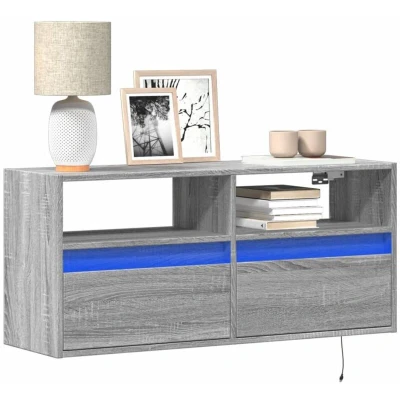 ManoManoGeneral description This TV wall cabinet is the perfect solution for your living space to maximize space and keep the floor areas uncluttered. The wall-mounted design maximizes unused wall space, converting it into a compact and efficient storage area. It features RGB LED lights that can be easily adjusted to create a personalized light show, allowing you to customize the modes, colors, and brightness to enhance the ambience of your interior space. With ample storage space provided by 2 drawers and 2 compartments, you can keep your daily essentials such as books, DVDs, and media supplies neatly organized and within easy reach. The floating TV cabinet offers endless design options, allowing you to use it alone or combine it with other TV wall units to create a complete entertainment center. Technical specifications Color: Grey sonoma Material: Engineered wood Dimensions: 100 x 31 x 45 cm (L x W x H) Number of drawers: 2 Number of compartments: 2 With LED lights Assembly required: Yes