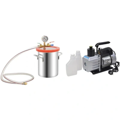 VidaXLThis handy vacuum chamber with pump is an excellent choice for degassing operations, vacuum encapsulation and more. Premium material: The stainless steel material ensures the vacuum tool's resistance to wear and pressure.Better observation: The transparent acrylic lid does not bend in vacuum operations, allowing a better view of the whole degassing process. The oil vacuum gauge and shock-resistant vacuum meter are also equipped for better monitoring.Reliable degassing: The degassing chamber is well-sealed to prevent leaks and provide a safe, reliable means for degassing.Wide Application: The device comes with one 2,5 CFM vacuum pump and one 5,5 L vacuum chamber of superior quality. It is suitable for refrigeration repair, vacuum packaging and other extraction operations.