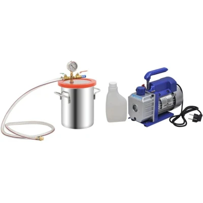 VidaXLThis handy vacuum chamber with pump is an excellent choice for degassing operations, vacuum encapsulation and more. Premium material: The stainless steel material ensures the vacuum tool's resistance to wear and pressure.Better observation: The transparent acrylic lid does not bend in vacuum operations, allowing a better view of the whole degassing process. The oil vacuum gauge and shock-resistant vacuum meter are also equipped for better monitoring.Reliable degassing: The degassing chamber is well-sealed to prevent leaks and provide a safe, reliable means for degassing.Wide Application: The device comes with one 2,5 CFM vacuum pump and one 5,5 L vacuum chamber of superior quality. It is suitable for refrigeration repair, vacuum packaging and other extraction operations.