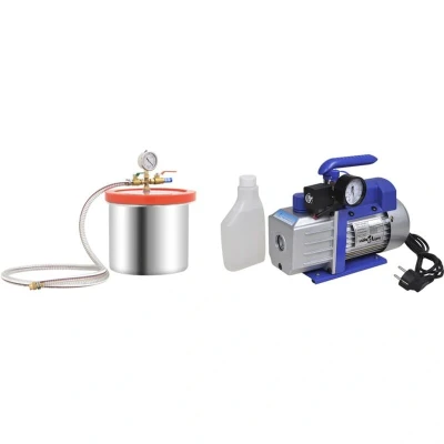 VidaXLThis handy vacuum chamber with pump is an excellent choice for degassing operations, vacuum encapsulation and more. Premium material: The stainless steel material ensures the vacuum tool's resistance to wear and pressure.Better observation: The transparent acrylic lid does not bend in vacuum operations, allowing a better view of the whole degassing process. The oil vacuum gauge and shock-resistant vacuum meter are also equipped for better monitoring.Reliable degassing: The degassing chamber is well-sealed to prevent leaks and provide a safe, reliable means for degassing.Wide Application: The device comes with one 2,5 CFM vacuum pump and one 7,4 L vacuum chamber of superior quality. It is suitable for refrigeration repair, vacuum packaging and other extraction operations.