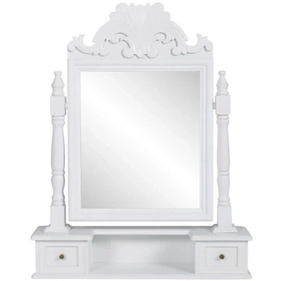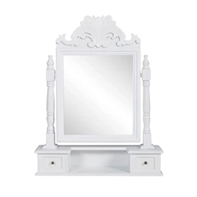 VidaXLThis beautifully finished vanity table features elaborate details all over. The workmanship gives it a classically elegant look.A stylish square mirror is placed on the center. The mirror can be adjusted to various angles as needed. The base holds two small pullout drawers that can store your valuables. This vanity table is made of high quality MDF. It can be put on top of chests or a table for a dressing table unit. This listing is for 1 vanity table with two drawers and 1 mirror.Note: Since this furniture is hand-crafted, made of wood and painted white, it may come with small defect.