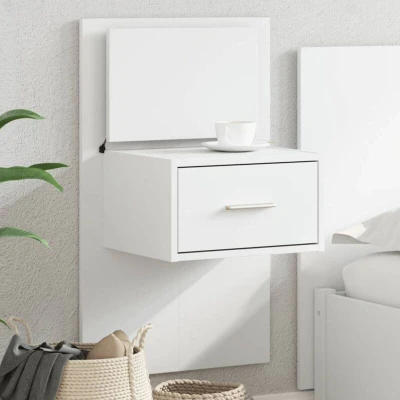ManoManoGeneral description This wall-mounted bedside cabinet is the perfect solution for your living space to maximize space and keep the floor areas clean. The engineered wood is of exceptional quality, featuring a smooth surface, strength, stability, and resistance to moisture. This floating bedside unit can be wall-mounted to add extra storage space, allowing you to keep the area tidy. The cabinet is equipped with vibrant LED lights that enhance its contemporary look and trendy appeal. It also has a sturdy tabletop for placing decorative items, photo albums, or small plants, and is easy to maintain with a damp cloth. Technical specifications Colour: White Material: Engineered wood Overall dimensions: 48.5 x 32.5 x 80 cm (W x D x H) Drawer outer size: 37 x 21.5 cm (L x W) Drawer inner dimensions: 35 x 23.5 x 17.5 cm (W x D x H) Maximum load capacity (total): 15 kg Assembly required: Yes Compatibility and accessories Screws and plugs for inside the wall are not included; it is advised to