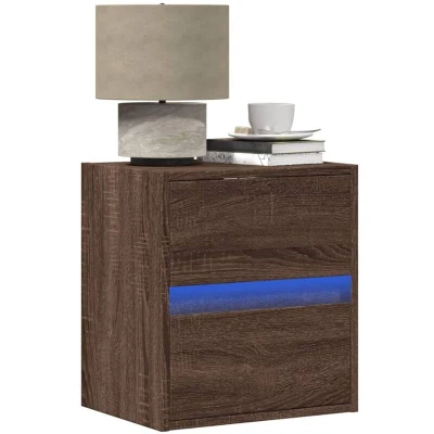 ManoManoGeneral description Upgrade your bedroom with this wall-mounted bedside cabinet featuring LED lights! It easily complements any furniture style in your home. The cabinet is designed to maximize unused wall space, converting it into a compact and efficient storage area. Technical specifications Colour: Brown oak Material: Engineered wood Dimensions: 41 x 31 x 45 cm (L x W x H) Number of drawers: 2 With LED lights Assembly required: Yes Installation Installation should be carried out according to the provided instructions to avoid safety risks. A wall attachment device is included, but suitable fixings for your wall type must be sourced separately. Check for any electrical wires or plumbing inside the wall before drilling. Regularly check that anchors are securely maintained. If in doubt, engage a qualified tradesperson for installation. Usage This bedside cabinet features RGB LED lights that can be easily adjusted to create a personalized light show. You can customize the modes,