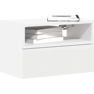 ManoManoGeneral description Whether you're reaching for your favorite book or storing your nighttime essentials, these wall-mounted bedside cabinets blend style and practicality, making them a great choice for your bedside. The floating nightstand can be wall-mounted to add extra storage space, maximizing your floor space and keeping the area clean. Technical specifications Colour: White Material: Engineered wood Overall dimensions (each): 45 x 26 x 28.5 cm (W x D x H) Dimensions of drawer: 45 x 26 x 15 cm (W x D x H) Number of drawers: 1 Total weight capacity: 60 kg Weight capacity per drawer: 5 kg Assembly required: Yes Delivery contains: 2 x Wall-mounted bedside cabinet Usage Ample storage space with one drawer and an open storage compartment for organizing books, magazines, or personal belongings. Designed for easy access from the bed, providing functionality and convenience. Easy to clean with a damp cloth due to its smooth surface, requiring less maintenance. Other information