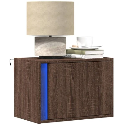 ManoManoGeneral description Upgrade your bedroom with these wall-mounted bedside cabinets featuring adjustable RGB LED lights. Their stylish brown oak finish easily complements any furniture style, while the wall-mounted design maximizes unused wall space, providing a compact and efficient storage solution. Technical specifications Colour: Brown oak Material: Engineered wood Dimensions (each): 50 x 31 x 35 cm (L x W x H) Number of drawers (each): 1 With LED lights Assembly required: Yes Delivery contains: 2 x Wall-mounted bedside cabinet Installation Installation should be carried out according to the provided instructions to avoid safety risks. A wall attachment device is included, but suitable fixings for your wall type must be sourced separately. Check for electrical wires or plumbing inside the wall before drilling. Regularly check that anchors are securely maintained. If in doubt, engage a qualified tradesperson for installation. Usage The product has a USB connector that requires a