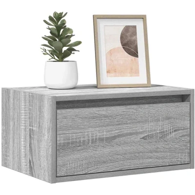ManoManoGeneral description Upgrade your bedroom with these wall-mounted bedside cabinets featuring LED lights! They easily complement any furniture style in your home. The bedside nightstand provides ample storage space for magazines, books, glasses, and other bedtime essentials, keeping them organized and within reach. The RGB LED lights can be easily adjusted to create a personalized light show, allowing you to customize the modes, colors, and brightness to enhance the ambience of your interior space. Technical specifications Colour: Grey sonoma Material: Engineered wood Overall dimensions: 51 x 35.5 x 25 cm (W x D x H) Drawer dimensions: 47 x 28.5 x 19 cm (W x D x H) Assembly required: Yes Power: DC 5V (USB power source not included) Installation Screws and plugs for inside the wall are not included. It is advised to find and use screws and plugs suitable specifically for your walls. If unsure, consult with a professional. Please read and follow each step of the instructions. Usage The