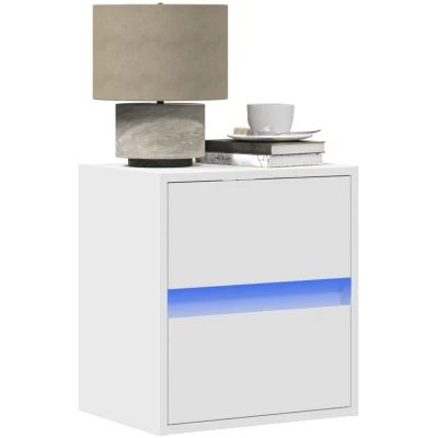 Upgrade your bedroom with these wall-mounted bedside cabinets featuring LED lights! They easily complement any furniture style in your home! Stable and durable material: Engineered wood is a durable and stable material with a smooth surface that is resistant to moisture, warping, and splitting, making it a reliable choice for a variety of projects.RGB LED Lights for a pleasant ambience: This bedside cabinet features LED lights that can be easily adjusted to create a personalised light show. You can customise the modes, colours, and brightness to enhance the ambience of your interior space.Ample storage space: This bedside nightstand has 2 drawers, providing ample space to keep your magazines, books, remote controls and other small items well-organised and within easy reach.Space saving: The wall-mounted design maximises unused wall space, converting it into a compact and efficient storage area. Good to know:Screws and plugs for inside the wall are not included. We advise you to find and use screws and plugs suitable specifically for your walls. If you're not sure, you can consult with a professional. Please read and follow each step of the instructions.The product has a USB connector that requires a certified 5V USB power source (not included).