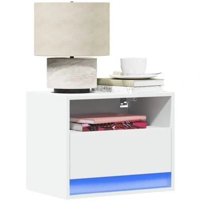 Upgrade your bedroom with these wall-mounted bedside cabinets featuring LED lights! They easily complement any furniture style in your home! Stable and durable material: Engineered wood is a durable and stable material with a smooth surface that is resistant to moisture, warping, and splitting, making it a reliable choice for a variety of projects.RGB LED Lights for a pleasant ambience: This bedside cabinet features LED lights that can be easily adjusted to create a personalised light show. You can customise the modes, colours, and brightness to enhance the ambience of your interior space.Ample storage space: This bedside nightstand has 1 drawer, providing ample space to keep your magazines, books, remote controls and other small items well-organised and within easy reach.Space saving: The wall-mounted design maximises unused wall space, converting it into a compact and efficient storage area. Good to know:Screws and plugs for inside the wall are not included. We advise you to find and use screws and plugs suitable specifically for your walls. If you're not sure, you can consult with a professional. Please read and follow each step of the instructions.The product has a USB connector that requires a certified 5V USB power source (not included).