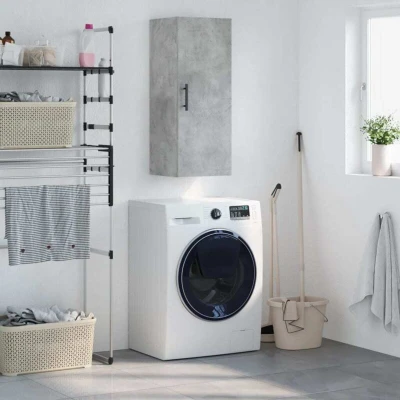 ManoManoGeneral description This wall mounted cabinet with an elegant design makes a timeless addition to your interior decor. Made of high-quality engineered wood, this storage cabinet is sturdy, durable, and resistant to moisture. The hanging cabinet offers ample storage space for keeping your various daily essentials well organized and within easy reach. Its wall-mounted function allows it to save floor space, and it can be easily hung on the wall. The practical design keeps your essentials free from dust by hiding them behind the door, and the handle makes it easy to open the side cabinet. This versatile cabinet can also be placed on top of a sideboard to form a highboard, creating extra storage space, making it suitable for your living room, bedroom, study, and any other living space. Technical specifications Colour: Concrete grey Material: Engineered wood Dimensions: 34.5 x 34 x 90 cm (W x D x H) Assembly required: Yes Other information Screws and plugs for inside the wall are not
