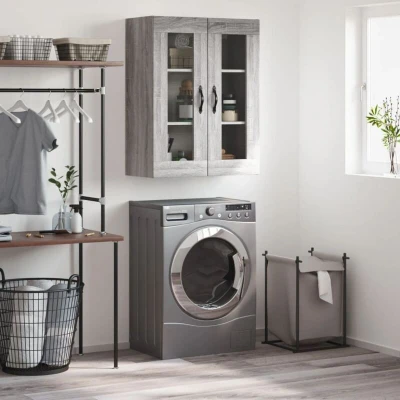 ManoManoGeneral description This wall-mounted cabinet features an elegant design, making it a timeless addition to your interior decor. Crafted from high-quality engineered wood, it offers strength, stability, and moisture resistance. The cabinet includes three compartments with doors, providing ample storage space for organizing your daily essentials. Its wall-mounted function saves floor space, and it can be easily hung on the wall. The stylish metal door handles enhance its attractiveness, while the versatile design allows it to be placed on top of a sideboard to create additional storage space. Technical specifications Colour: Grey sonoma Material: Engineered wood, metal, glass Dimensions: 69.5 x 34 x 90 cm (W x D x H) Assembly required: Yes Installation Screws and plugs for wall mounting are not included; it is recommended to use screws and plugs suitable for your specific wall type. Consult a professional if unsure about the installation process. Follow each step of the provided