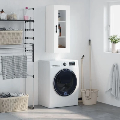 ManoManoGeneral description This wall-mounted cabinet features an elegant design, making it a timeless addition to your interior decor. It is crafted from high-quality engineered wood, ensuring durability and resistance to moisture. The cabinet offers ample storage space for organizing daily essentials while keeping them easily accessible. Technical specifications Colour: White Material: Engineered wood, glass Dimensions: 34.5 x 34 x 90 cm (W x D x H) Assembly required: Yes Installation Screws and plugs for wall mounting are not included; it is recommended to use screws and plugs suitable for your specific wall type. Consult a professional if unsure about installation. Follow the provided instructions carefully during assembly. Usage The cabinet can be hung on the wall, saving floor space. It can also be placed on top of a sideboard to create a highboard, providing additional storage. The glass door allows visibility of contents while protecting them from dust. The handle facilitates easy