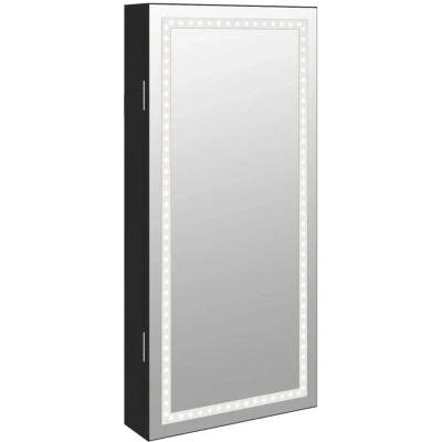 ManoManoGeneral description Keep your jewellery and perfumes discreetly and elegantly stored away with this stylish mirror jewellery cabinet with LED lights. The cabinet features a practical mirror, ample storage space, and a lockable door for added security. Technical specifications Colour: Black Material: Engineered wood, glass, fabric (100% polyester) Filling material: Foam Overall dimensions: 31.5 x 9 x 67 cm (W x D x H) Lockable design Features a frameless mirror Assembly required: Yes Compatibility and accessories Screws for wall mounting are included. 3 AA batteries are required but not included in the delivery. Usage This jewellery cabinet is perfect for organizing your jewellery and applying make-up. The LED lights enhance visibility and add a stylish touch to your room décor. Other information