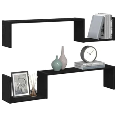 ManoManoGeneral description The Modern Wall-Mounted Oak Shelves are a fantastic addition to any living room. With a lovely rectangular design, they blend functionality with style, bringing a touch of simple elegance into your home. The clean lines and minimal fuss of the matte wood make it a hit with modern tastes. These shelves transform bare walls into useful spots for displaying decorative items or keeping everyday essentials tidy, fitting in nicely with various styles. Technical specifications Colour: Black oak Material: Engineered wood Overall dimensions: 100 x 15 x 20 cm (L x W x H) Weight: 4.3 kg Number of items: 2 Assembly required: Yes EAN: 8721158770547 SKU: 862655 Installation Wall-mounted installation keeps floors clear and adds vertical flair to your room. Requires two people, a screwdriver, and a drill for secure setup. Usage Perfect for smaller spaces where floor room is tight, maximizing utility without losing style. Ideal for displaying books, knick-knacks, or other