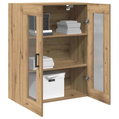 ManoManoGeneral description The Modern Wall-mounted Cabinet is a stylish storage solution that combines simplicity, functionality, and clean lines. Perfect for saving space, it features an elegant matte finish and glass doors, making it suitable for various room styles. Fixed to the wall, it seamlessly integrates into your space while keeping your essentials organized, adding a modern touch to your living area. Technical specifications Colour: Artisan oak Material: Engineered wood Overall dimensions: 69.5 x 34 x 90 cm (W x D x H) With 2 doors Assembly required: Yes EAN: 8721158789488 SKU: 862169 Brand: vidaXL Installation Assembly is required according to the provided instructions. Two people and a screwdriver are needed for setup. Ensure the cabinet is securely fastened to a suitable wall for stability. Usage Ideal for modern homes, the cabinet provides a practical solution for storing essentials while maximizing floor space. The glass doors allow for easy viewing of stored items while