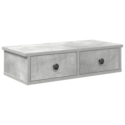 ManoManoGeneral description This wall shelf with drawers serves as both a decorative and practical addition to your home decor. It is designed to provide ample storage space while enhancing the aesthetic of any room. Technical specifications Colour: Concrete grey Material: Engineered wood Overall dimensions: 60 x 28 x 15 cm (W x D x H) Dimensions of each drawer: 26 x 21.5 x 11.5 cm (W x D x H) Maximum weight capacity: 60 kg Assembly required: Yes Installation Screws and plugs for wall mounting are not included. It is recommended to use screws and plugs suitable for your specific wall type. If unsure, consult with a professional for installation advice. Follow each step of the provided instructions carefully during assembly. Usage This wall-mounted shelf is ideal for organizing daily essentials and can also be used to display decorative items such as photos, plants, or other ornaments. Other information
