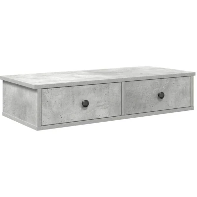 ManoManoGeneral description This wall shelf with drawers serves as both a decorative and practical addition to your home decor. Its floating design allows it to be mounted on the wall, saving valuable floor space while providing ample storage for your daily essentials. Technical specifications Colour: Concrete grey Material: Engineered wood Overall dimensions: 80 x 31 x 17 cm (W x D x H) Dimensions of each drawer: 36 x 26.5 x 13.5 cm (W x D x H) Maximum weight capacity: 60 kg Assembly required: Yes Installation Screws and plugs for wall mounting are not included. It is recommended to use screws and plugs suitable for your specific wall type. If unsure about installation, consulting a professional is advised. Please read and follow each step of the provided instructions carefully. Usage This wall shelf is ideal for displaying your favorite photos, decorations, or flowers, enhancing your living space while keeping your essentials organized and easily accessible. Other information