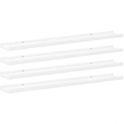 General description Maximize your interior storage space and transform your wall into an attractive feature with these practical and decorative wall shelves. Made from sturdy and durable MDF, these wall-mounted shelves are perfect for displaying items such as succulents, books, collectibles, and ornaments. You can mount them above a cupboard, sofa, or table to refresh your room and create a glamorous atmosphere. The shelves are easy to clean with a damp cloth. Technical specifications Colour: White Material: MDF Dimensions: 100 x 9 x 3 cm (W x D x H) Maximum load capacity (each): 5 kg Assembly required: Yes Other information Mounting material is not included. Delivery contains: 4 x Wall shelf