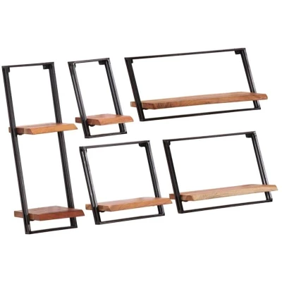 ManoManoGeneral description Maximize your interior space and turn your wall into style with these wall shelves! Made from robust solid acacia wood, these shelves are known for their strength and durability. Their diverse colors and unique grain patterns give them an attractive appearance, making them ideal for both indoor and outdoor furniture. The rustic live edge design showcases knots, cracks, and varying color tones, ensuring that each piece has its unique character. Technical specifications Material: Solid acacia wood with a natural finish, powder-coated steel Shelf dimensions (1): 25 x 25 x 75 cm (W x D x H) Shelf dimensions (2): 20 x 25 x 33 cm (W x D x H) Shelf dimensions (3): 35 x 25 x 33 cm (W x D x H) Shelf dimensions (4): 65 x 25 x 33 cm (W x D x H) Shelf dimensions (5): 50 x 25 x 33 cm (W x D x H) Assembly required: Yes Delivery contains: 5 x Wall shelf Usage This multifunctional wall shelf is perfect for both decorating and storing items in your home. Use it to display