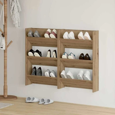 ManoManoGeneral description This wall-mounted shoe cabinet adds a touch of style to any hallway or living area. With its modern look, it helps organize clutter while providing space for all sorts of shoes. Its rectangular shape fits nicely against walls, and it's made of sturdy engineered wood, making it practical and tough enough for daily use. Technical specifications Colour: Artisan oak Material: Engineered wood Weight: 19.25 kg Storage: 2 shelves Indoor / outdoor: Indoor only Assembly required: Yes Compatibility and accessories Mounting included: Wall / ceiling fixtures (specific screws or wall plugs not included) Usage Sleek Design: The wall-mounted shoe cabinet has a modern vibe that matches contemporary decor nicely. Its clean lines fit snugly against walls, making it ideal for narrow hallways or entrances without skimping on style. Spacious Shelving: With solid shelves, this cabinet offers ample space for all types of shoes, whether they're trainers or fancy heels. Functional Storage: