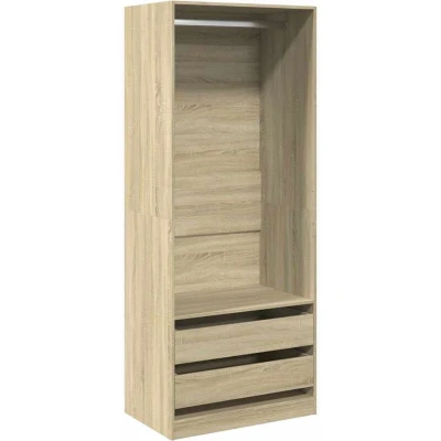 ManoManoGeneral description Clean up your clothes and easily pick out your outfit with this stylish and compact wardrobe. Made from high-quality engineered wood, it features a smooth surface that offers strength, stability, and moisture resistance. The minimalist design allows it to blend seamlessly into any room, making it perfect for small spaces. Technical specifications Colour: Sonoma oak Material: Engineered wood Dimensions: 80 x 50 x 200 cm (W x D x H) Assembly required: Yes Usage This hallway cupboard includes 1 compartment and 2 drawers, providing ample storage space for your clothes, hats, gloves, or other essentials. Other information Warning: To prevent it from tipping over, this product must be used with the provided wall attachment device.