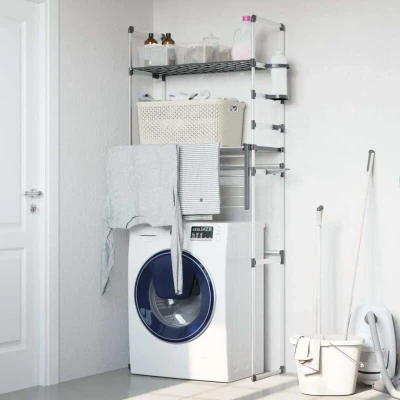 ManoManoGeneral description This washing machine shelf is your ideal storage solution for maximizing space in your bathroom. It offers ample storage for daily essentials and drying laundry, while the hooks and fittings on both sides help keep everything organized. Technical specifications Material: Aluminium, PS (polystyrene) Dimensions: 77 x 52 x 192 cm (L x W x H) Total hanging length: 7 m Colour: Silver Assembly required: Yes Other information