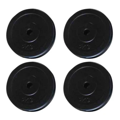 General description These 4 x 5 kg weight plates are designed for professional dumbbell workouts at home. Made of concrete and covered with robust, floor-friendly plastic, these plates minimize annoying clanging sounds during use. Technical specifications Material: Concrete with plastic covering Weight per plate: 5 kg Number of discs: 4 Plate diameter: 25 cm Hole diameter: 26.5 mm Other information