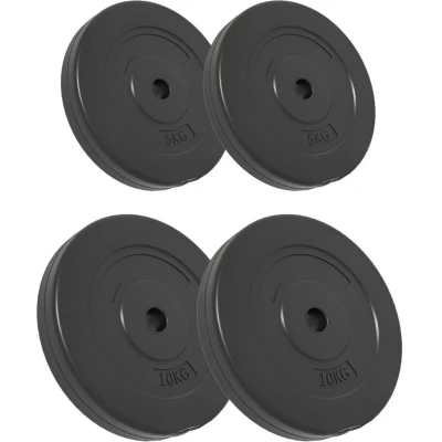 ManoManoGeneral description These 4 weight plates are designed for professional dumbbell workouts at home. They are made of durable cement and covered with robust, floor-friendly plastic, ensuring a quiet workout without annoying clanging sounds. Technical specifications Material: Cement with plastic covering Colour: Black Total weight: 30 kg Weight distribution: 2 x 10 kg and 2 x 5 kg Diameter of 10 kg plates: 31 cm Diameter of 5 kg plates: 26 cm Hole diameter: 2.7 cm Suitable barbell diameter: 2.5 cm (barbell not included) Delivery contains 2 x Plate (5 kg) 2 x Plate (10 kg) Other information