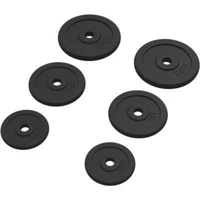 ManoManoGeneral description This set includes 6 weight plates: 2 pcs of 7.5 kg, 2 pcs of 5 kg, and 2 pcs of 2.5 kg. It is designed for muscle strengthening and shaping when used with a barbell, dumbbell, or curl bar with a diameter of 3 cm. Technical specifications Material: Cast iron with baked enamel powder-coated finish Colour: Black Total weight: 30 kg Weight distribution: 2 x 2.5 kg, 2 x 5 kg, 2 x 7.5 kg Diameter of 7.5 kg plates: 25 cm Diameter of 5 kg plates: 21 cm Diameter of 2.5 kg plates: 16 cm Hole diameter: 3 cm Compatibility and accessories Suitable for barbell with a diameter of 3 cm (barbell not included) Usage Ideal for training chest, biceps, arms, triceps, and back muscles Other information