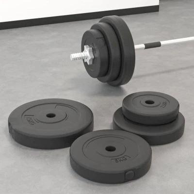 ManoManoGeneral description These weight plates are designed for professional dumbbell workouts at home. They are made of durable cement and covered with robust, floor-friendly plastic, ensuring a quiet workout without annoying clanging sounds. Technical specifications Material: Cement with plastic covering Colour: Black Total weight: 30 kg Weight distribution: 2 x 2.5 kg, 2 x 5 kg, 2 x 7.5 kg Diameter of 7.5 kg plates: 30 cm Diameter of 5 kg plates: 26 cm Diameter of 2.5 kg plates: 21 cm Hole diameter: 2.7 cm Suitable barbell diameter: 2.5 cm (barbell not included) Other information Each product comes with an assembly manual in the box for easy assembly.