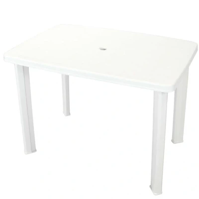 General description This weather-resistant garden table is an excellent choice for al fresco dining in the garden, on the patio, or at the campsite. Made from durable plastic, it is easy to clean and maintain. The table features an umbrella hole, allowing you to stay cool in the shade, and its lightweight design makes it easy to move around. Assembly is straightforward. Technical specifications Color: White Material: Plastic Dimensions: 101 x 68 x 72 cm (L x W x H) Umbrella hole diameter: 3.5 cm Weather resistant Easy assembly Other information