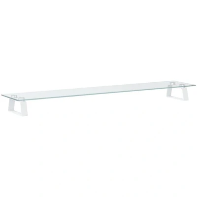 General description This practical monitor stand with a minimalist design will add a modern touch to your living space. The computer stand is made of tempered glass and metal, making it exceedingly sturdy and stable. It raises your monitor up to eye level for a comfortable ergonomic viewing experience, relieving strain on the neck, shoulder, and back. The storage space underneath this monitor riser can accommodate your keyboard, DVD player, gaming console, streaming device, receivers, media carriers, notebooks, pens, and similar items, helping to organize your desk and increase efficiency. The smooth rounded corners ensure safety during use. Technical specifications Colour: White Material: Clear tempered glass, metal Overall dimensions: 100 x 20 x 8 cm (L x W x H) Leg dimensions (each): 16 x 3 x 6.5 cm (L x W x H) Glass thickness: 5 mm Max. load capacity: 10 kg Assembly required: Yes Other information