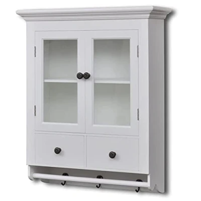 In addition to the shelves and drawers, this wooden wall cabinet comes with hooks and pegs that are perfect for hanging mugs or kitchen towels. This additional feature helps maximize vertical space in your kitchen, making it easier to keep everything within reach while maintaining an organized environment.