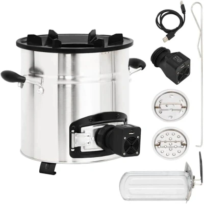 This wood stove with a USB fan serves as a cooking utensil when you have outdoor activities while creating some extra warmth and a cosy atmosphere when it gets colder. Cast iron hearth: The fireplace features a durable, six-prong cast iron hearth frame. The low-profile design reduces the risk of chipping and can support a variety of cookware to suit all your outdoor cooking needs.Portable fan: The stove fan, with 3 operating modes, can heat up the wood-burning stove quickly. Thus, there is no need to blow it with your mouth. You can manage the firepower by pressing the button one or more times.Door design: The camping stove is also designed with a door at the bottom, which is used to assemble the fan. Additionally, you can remove cooled ash from the hole using the ashtray.Convenient handles: The outdoor heater for camping is equipped with 2 handles, allowing you to move the rocket stove safely. Note:The product has a USB connector, but the certified 5V USB power source is not included.Each product comes with an instruction manual in the box for easy assembly and use.The product must be only used outdoors.To avoid injuries and burns, do not touch the product when there is still burning wood inside or shortly after it.