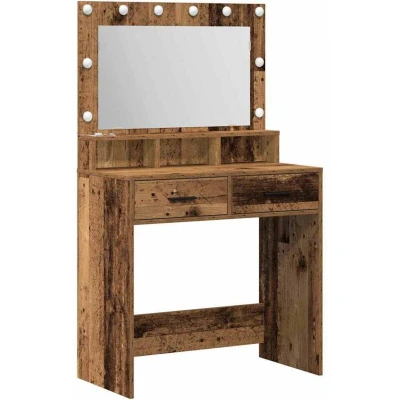ManoManoGeneral description This dressing table is a stylish piece meant for modern bedrooms. It's crafted with a neat, minimalist design that emphasizes simplicity and usefulness. Its rectangular shape and smooth finish make it a lovely focal point, fitting in with various bedroom styles. The built-in LED lights enhance its charm and are very handy, making grooming a breeze. Technical specifications Material: Engineered wood Colour: Old wood Overall dimensions: 79 x 41 x 135 cm (L x W x H) Weight: 26.85 kg Power source: Plug With drawer With plane mirror With shelf Indoor use only Assembly required: Yes EAN: 8721158851178 SKU: 865089 Usage The embedded plane mirror allows for easy makeup application and hairstyling. Ample storage options with roomy drawers help keep personal care products and cosmetics organized. Easy to clean; just wipe with a damp cloth to maintain its appearance. Other information Please use only certified DC 5V input. Higher voltage may cause overheating and damage to