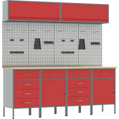 ManoManoThis durable work cabinet set is crafted with a balance of functionality and form, bringing both utility and aesthetics to any indoor workshop. With a sleek rectangular design and a modern style, it caters to enthusiasts and professionals who appreciate refined, organized settings. Its compelling structure facilitates ease of use, making it optimal for storing and organizing tools while maintaining a clean appearance in spaces dedicated to work. Materials: The combination of powder-coated steel and engineered wood endows this cabinet set with a robust and long-lasting construction. The steel provides a rigid, protective enclosure, whereas engineered wood adds an appealing touch to its overall look. This harmonious integration of materials offers both strength and sophistication. Included Components: The work cabinet boasts manually adjustable foot pegs, which can be modified to suit various height requirements. This feature ensures comprehensive utility and comfort during use,