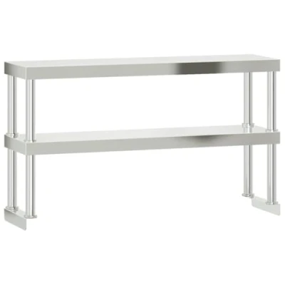 VidaXLThis 2-tier work table overshelf is ideal for making the most of your prep space or workspace. Durable material: The gastronomy table shelf is made of durable stainless steel, providing resistance to corrosion and rust and ensuring years of reliable use.Added workspace: The overshelf is designed to be mounted directly on top of an existing stainless steel table or workstation, which can increase your storage and workspace.Wide application: The over table rack is suitable for use in kitchens, factories, restaurants, workshops, bakeries, etc.Easy to assembly: Assembly is easy with no tools required by screwing in legs to plates.