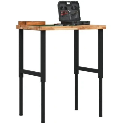 ManoManoGeneral description The workbench is a great helper whether you want to finish repair work or fulfill your DIY dreams! Made from robust solid acacia wood, it is known for its strength and durability, featuring diverse colors and unique grain patterns that give it an attractive appearance. The powder-coated metal frame ensures stability and resistance to corrosion and harsh weather, making it suitable for both indoor and outdoor use. Technical specifications Overall dimensions: 80 x 60 x (73-99.5) cm (L x W x H) Tabletop material: Solid acacia wood with a natural oil finish Work bench top thickness: 4 cm Table leg color: Black Table leg material: Powder-coated metal Table leg size: 55 x (69-95.5) cm (W x H) Recommended screw size (not included): 5 x 40 mm (Diameter x L), max. 16 pcs Height adjustable Assembly required: Yes Installation This tabletop has no predrilled holes; screws are not included. Therefore, holes have to be predrilled, and screws must be purchased before assembling